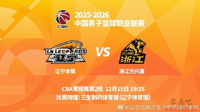 12月15日晚,辽宁男篮将在辽宁体育馆迎来2025-2026赛季CBA首个主场比赛,对手是上赛季冠军浙江方兴渡男篮。