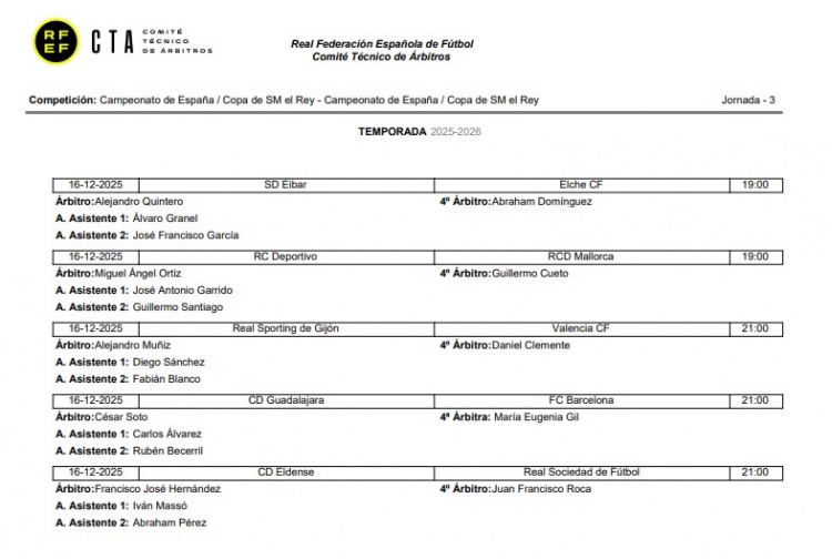 零点吧足球12月15日讯 本周中,西班牙国王杯1/16决赛将拉开战幕,西班牙足协官方公布了相关比赛的裁判安排,其中,索托执法巴萨客战瓜达拉哈拉。