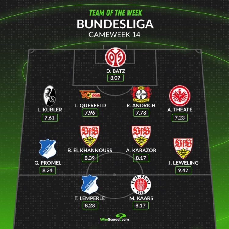 中场:格里沙·普勒梅尔(霍芬海姆,8.24分)、比拉尔·埃尔哈努斯(斯图加特,8.39分)、阿塔卡恩·卡拉佐尔(斯图加特,8.17分)、杰米·勒威林(斯图加特,9.42分)