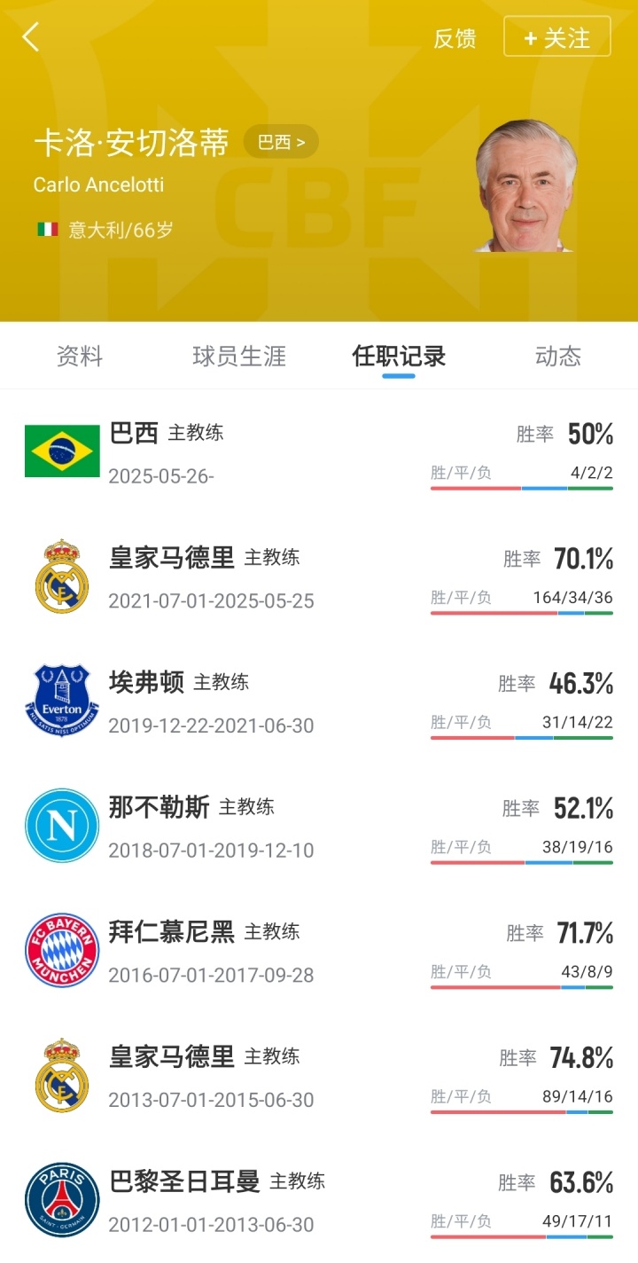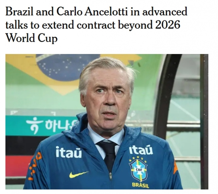 安切洛蒂于今年五月上任,初始合同为期一年,直至2026年世界杯结束。他是巴西男足队史上首位外籍主帅。