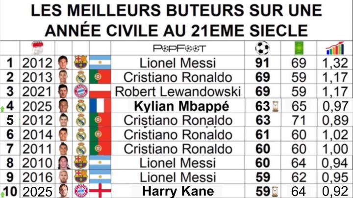 在21世纪自然年进球榜上,姆巴佩63球的成绩已经超越2012年的C罗来到第4。在2025年皇马仅剩2场比赛,想达到2013年C罗、2021年莱万的69球已经几乎不可能。在这份榜单的榜首,2012年梅西的91球仍遥不可及。