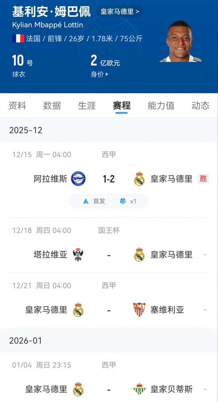 零点吧足球12月15日讯 在凌晨的西甲第16轮比赛中,姆巴佩破门帮助皇马2-1战胜阿拉维斯,姆巴佩的个人年度进球也来到了63粒。