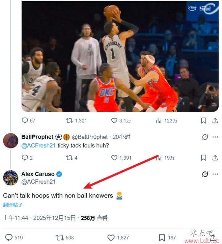 零点吧12月16日讯 此前雷霆不敌马刺的赛后,卡鲁索在球员通道抱怨“XXXX,那些体毛哨(ticky tack fouls)。”