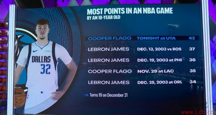 据统计,18岁球员单场得分榜前五如图,詹姆斯和弗拉格霸榜。