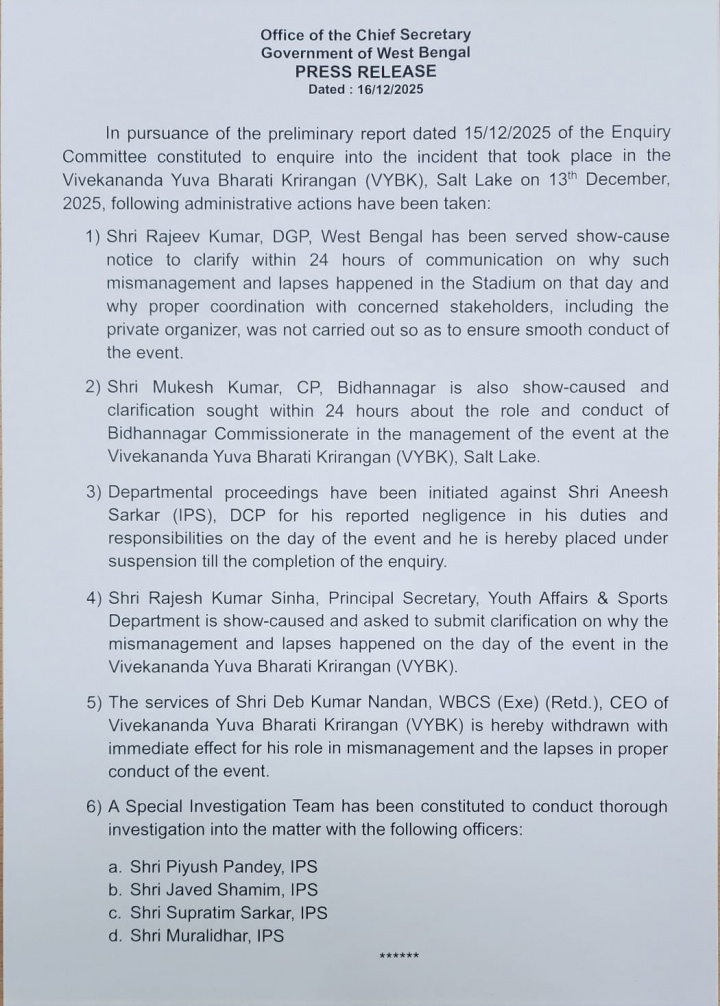 1.已向西孟加拉邦警察总长库马尔发出通知,要求其在收到通知后24小时内作出说明,解释为何当天体育场出现如此严重的管理不善和疏漏,以及为何未与包括私人组织方在内的相关利益方进行妥善协调,以确保活动顺利进行。