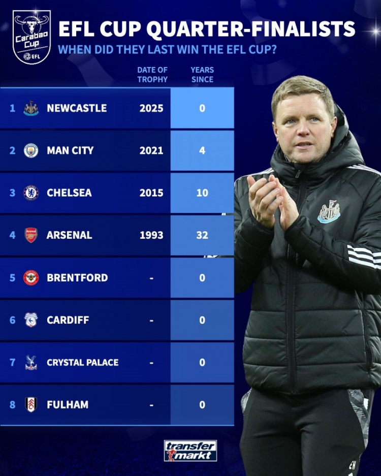 零点吧足球12月16日讯 英格兰联赛杯八强战即将开战,《转会市场》也统计了八强球队上次在联赛杯夺冠距今的时间。