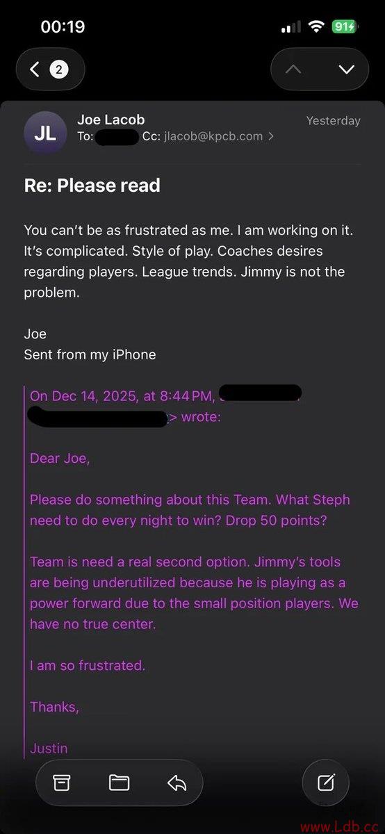 零点吧12月17日讯 今日一位勇士球迷给勇士队老板乔·拉科布发了一封电子邮件,得到了拉科布本人的回复。