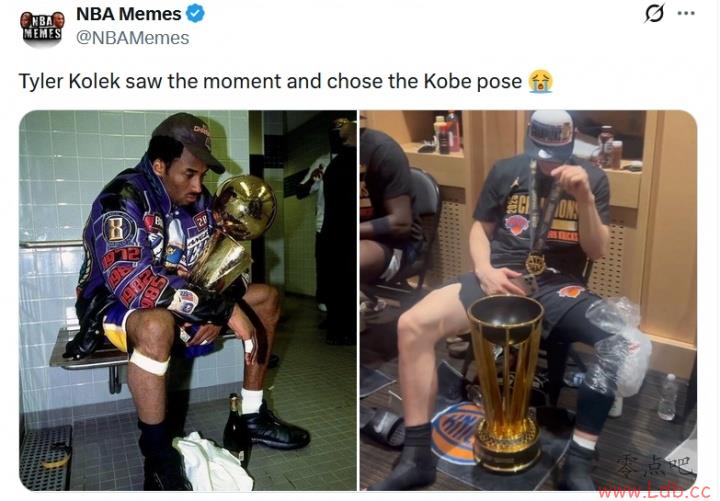 致敬传奇??!尼克斯二轮秀科勒克模仿科比的姿势与冠军奖杯合影