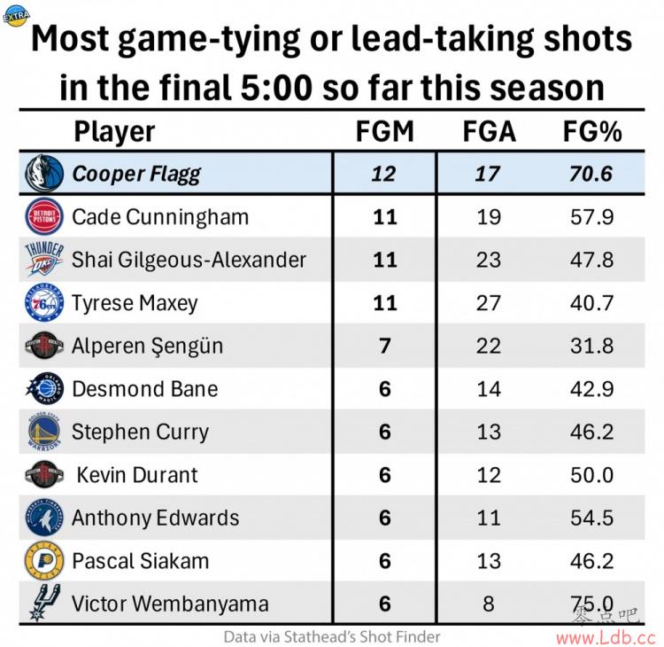最后5分钟扳平/反超球数:弗拉格12个第1 申京7个第4 库里KD均6个