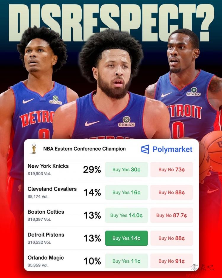 活塞队以21胜5负的战绩领跑东部,但据预测机构Polymarket预测,他们进入总决赛的概率仅为13% ??