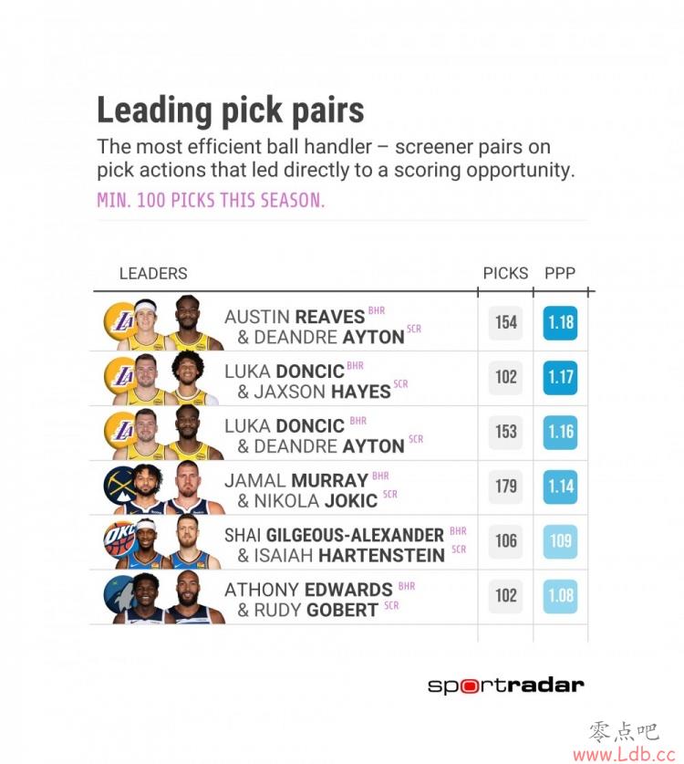 赛季至今,打过至少100次挡拆配合的二人组,效率最高的是里夫斯和艾顿,每回合1.18分,排在第2的是东契奇和海斯,每回合1.17分,排在第3的还是一对湖人组合,东契奇和艾顿,每回合1.16分。