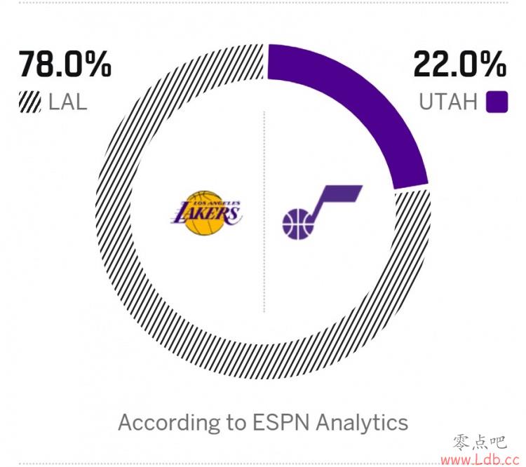ESPN对本场比赛胜率进行了预测,湖人78%,爵士22%。