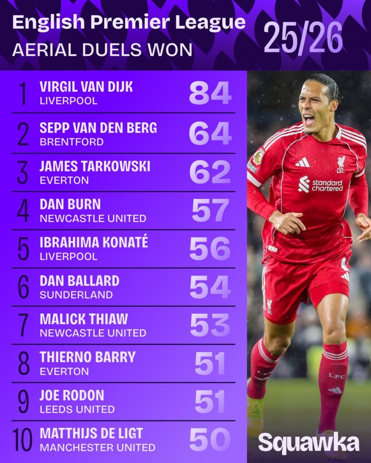 此外,范戴克争顶成功率为80%,在所有至少参与25次及以上争顶的球员中,成功率最高。