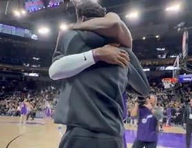 GIF-詹姆斯昨天赛后第一时间和场边观战的25年状元大热AJ·迪班萨拥抱耳语