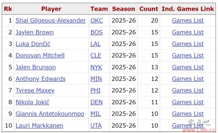 根据数据统计,这是杰伦·布朗本赛季第16次30+,在本赛季30+场次排行榜上,他目前排名东部第一,联盟第二(仅次于亚历山大的20次)。