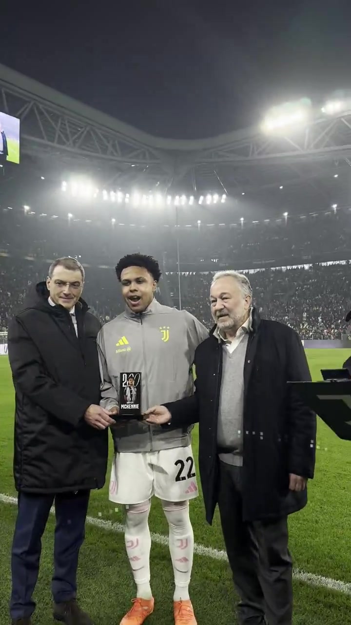 对阵罗马赛前,尤文为麦肯尼颁发200场纪念奖杯