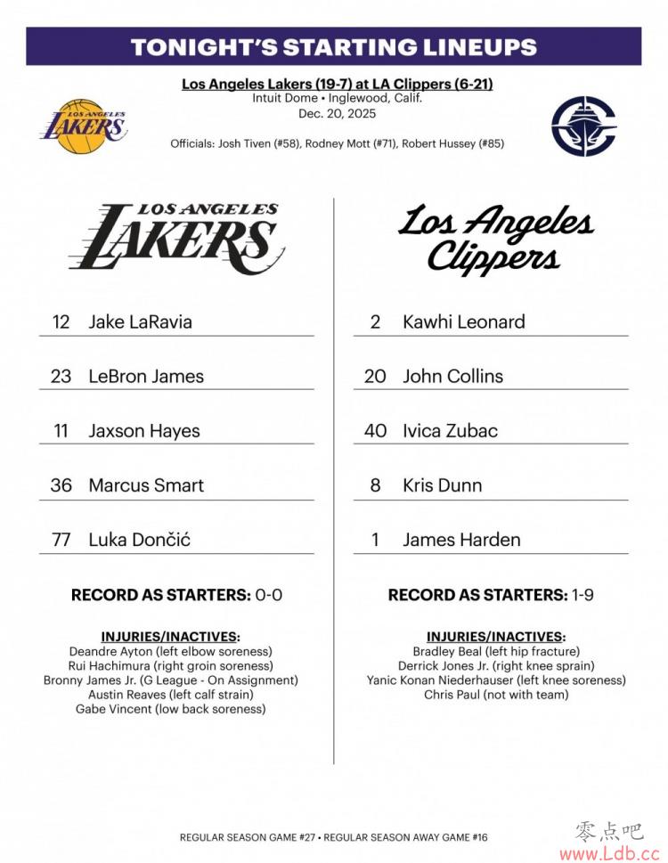 - 21日 洛城德比,湖人客场挑战快船