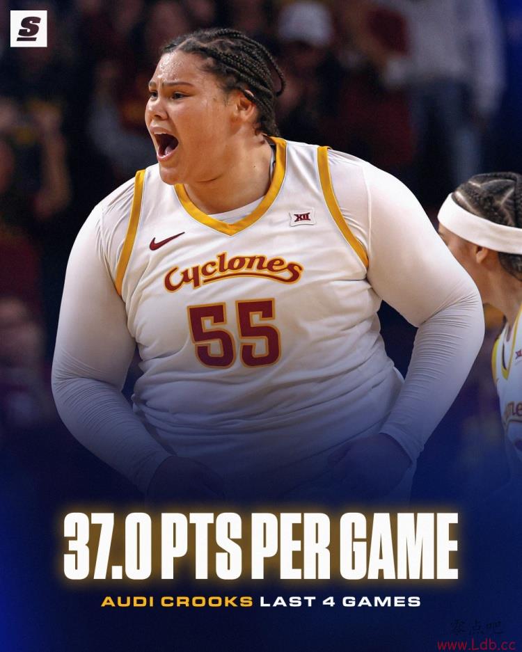 爱荷华州立球员奥迪·克鲁克斯出场30分钟,砍下41分4篮板3助攻,投篮命中率67.9%。