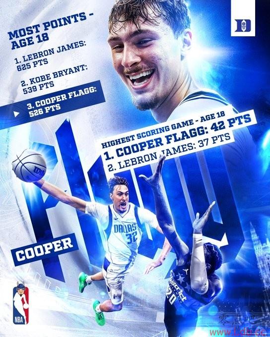 杜克官方晒出了弗拉格19岁前的几项纪录的数据海报:
