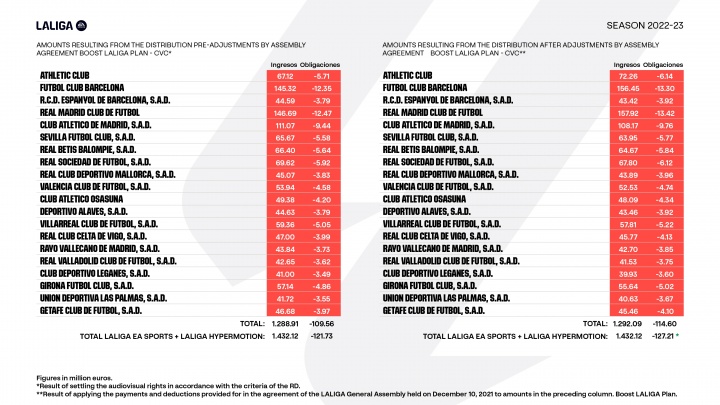 另一方面,马德里竞技是电视转播收入第三高的球队,但其收入也从1.1789亿欧元下降至1.0817亿欧元。除了上赛季升班的三支球队以及赫罗纳之外,其他俱乐部的分成均有所下降。
