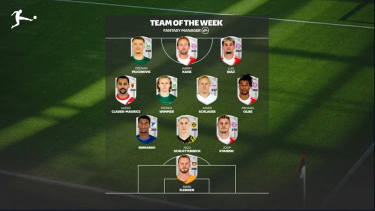 德甲第15轮官方最佳阵:凯恩、路易斯·迪亚斯、奥利塞在列