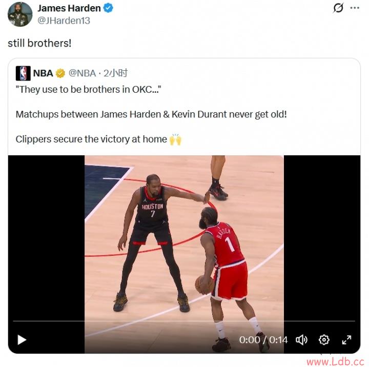 赛后,NBA官推晒出哈登与杜兰特对位的集锦,并配文道:“他们在雷霆时曾经是兄弟,哈登与杜兰特的对位百看不厌,快船在主场确保了胜利。”