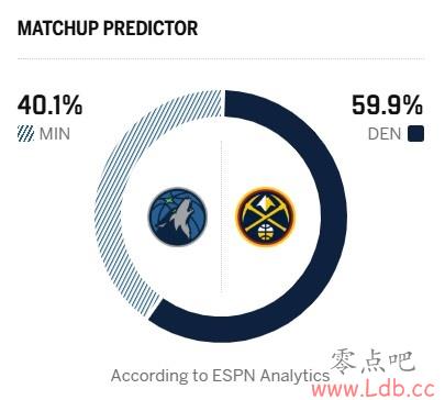 ESPN给出了本场比赛的胜率预测,其中主场作战的掘金胜率为59.9%,森林狼为40.1%。
