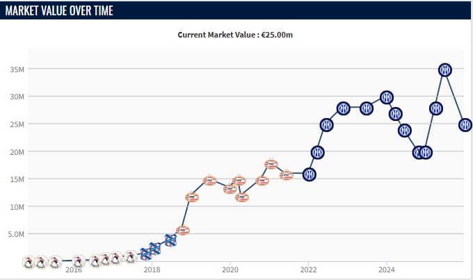 去年12月,邓弗里斯身价2000万欧。因为2025年上半年的优异表现,他的身价暴涨到3500万欧,被戏称为“凌晨3点的泥头车是不可阻挡的”。但是下半年开始,邓弗里斯表现下滑,本赛季意甲11场1球,上个月受伤后,缺席至今。这次身价更新,邓弗里斯暴跌1000万欧,还剩2500万。