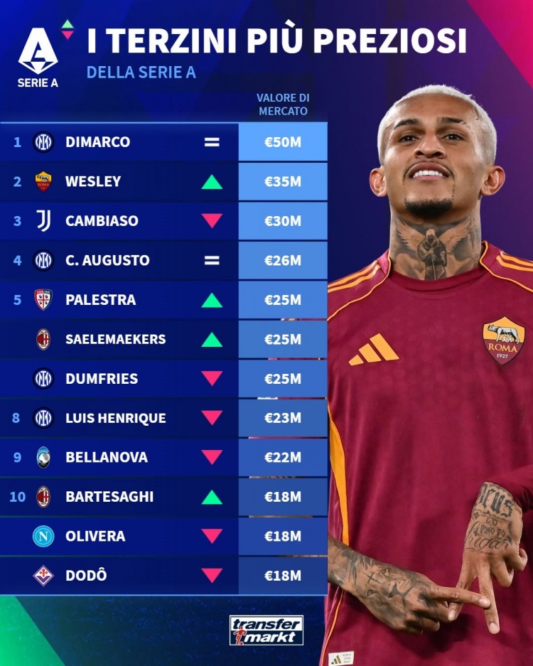 零点吧足球12月25日讯 德转本周更新了意甲最新身价,今日德转晒出了意甲边后卫的身价TOP10榜单,迪马尔科5000万欧继续排在第一,罗马右后卫韦斯利升至3500万欧超越坎比亚索来到第二位。