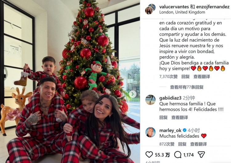 零点吧足球12月26日讯 切尔西中场恩佐更新社媒,晒出圣诞节合照,并写下圣诞节祝福。