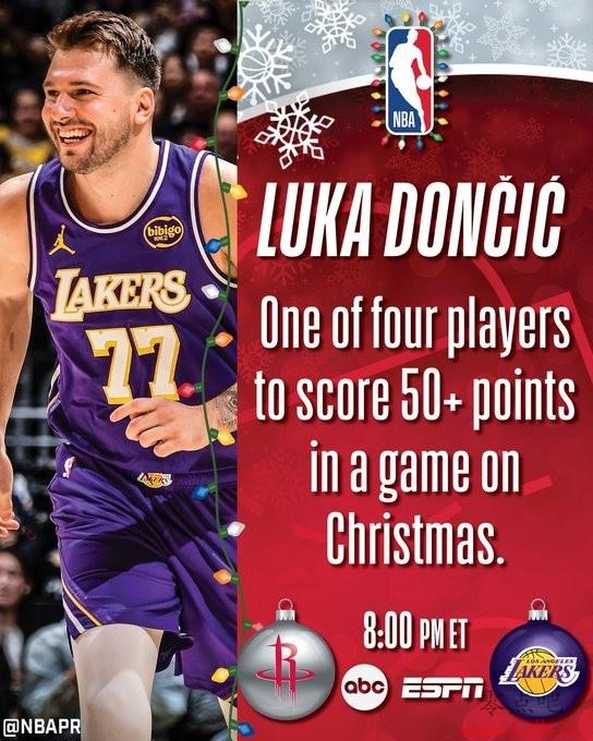 官推写道:历史上只有四位球员在圣诞大战砍下50+,东契奇就是其中之一。