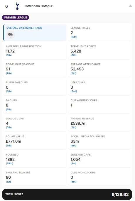 17项数据分别为:赢得的联赛冠军、历史平均联赛排名(英冠第一名算作第21名,英甲第一名算作第45名,以此类推)、顶级联赛总积分、顶级联赛赛季总数、过去10个赛季的平均上座率、赢得的欧洲冠军杯(包括欧冠联赛)、赢得的欧洲联盟杯(包括欧联杯)、赢得的足总杯、赢得的欧洲优胜者杯、赢得的联赛杯、年度收入、球队价值、社交媒体粉丝数(Facebook、X和Instagram)、成立日期、球员为该俱乐部效力时获得的英格兰队出场次数、在该俱乐部效力的英格兰国脚人数以及赢得的世俱杯。