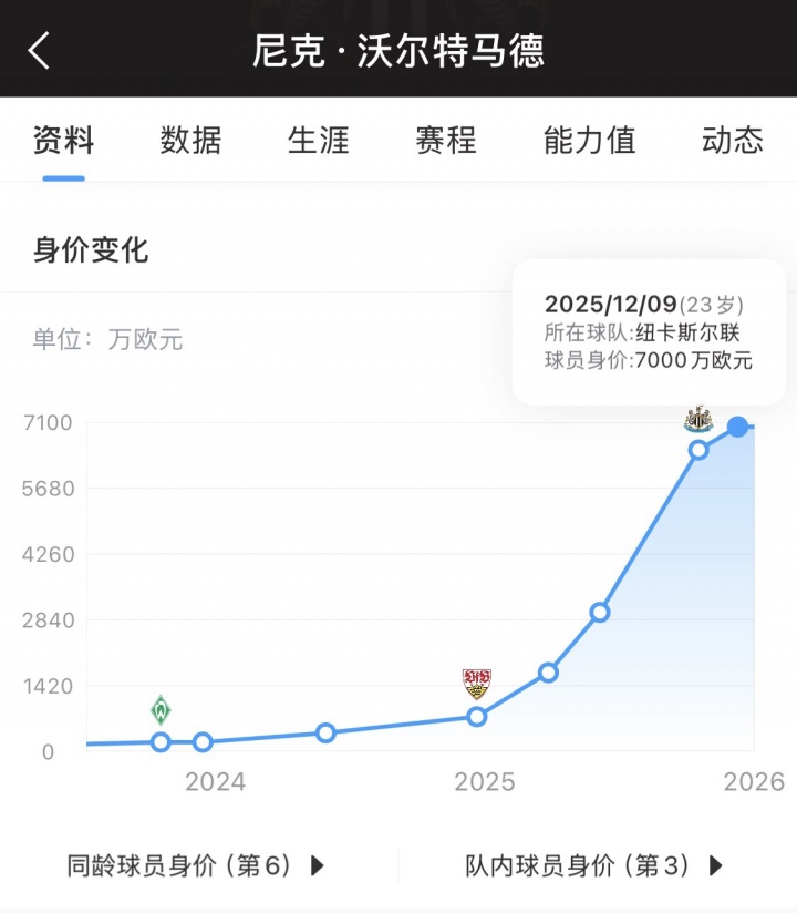 德转更新最新英超球员身价,沃尔特马德的身价一年涨幅达833%,去年12月他的身价为750万欧,如今已达到7000万欧。