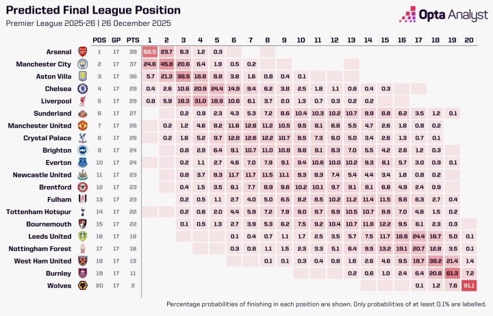 Opta预测英超:枪手夺冠概率68.5%第1曼城第2,狼队降级概率99.9%