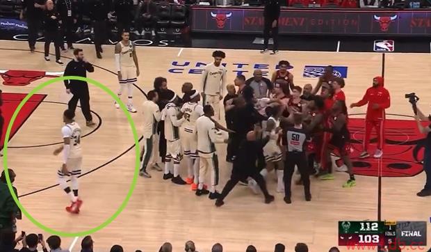 比赛垃圾时间,字母哥秀了个大风车暴扣,惹恼武切维奇,波蒂斯火上浇油引发多人冲突。