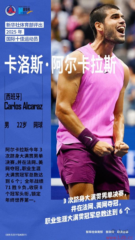 阿尔卡拉斯今年3次跻身大满贯男单决赛,并在法网、美网夺冠,职业生涯大满贯冠军总数达到6个;全年战绩71胜9负,收获8个冠军头衔,锁定年终世界第一。
