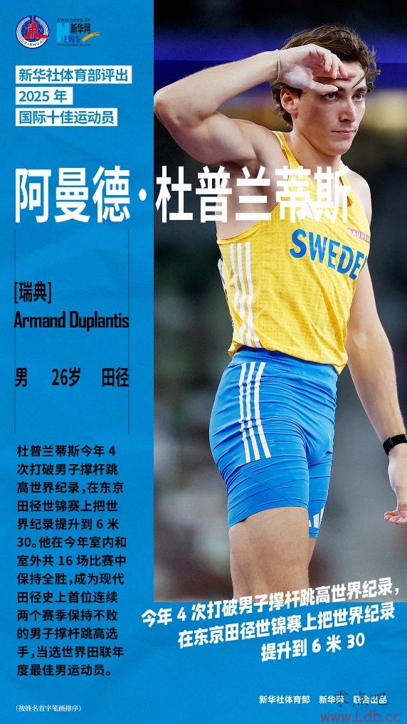 杜普兰蒂斯今年4次打破男子撑杆跳高世界纪录,在东京田径世锦赛上把世界纪录提升到6米30。他在今年室内和室外共16场比赛中保持全胜,成为现代田径史上首位连续两个赛季保持不败的男子撑杆跳高选手,当选世界田联年度最佳男运动员。