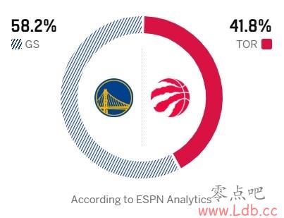 ESPN对本场比赛两队胜率进行预测:勇士58.2% ,猛龙41.8%。