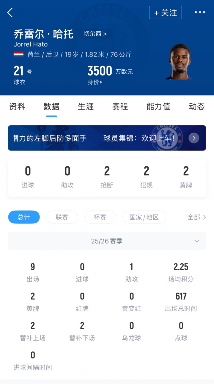 哈托本赛季各项赛事仅代表切尔西出战9场贡献一次助攻。
