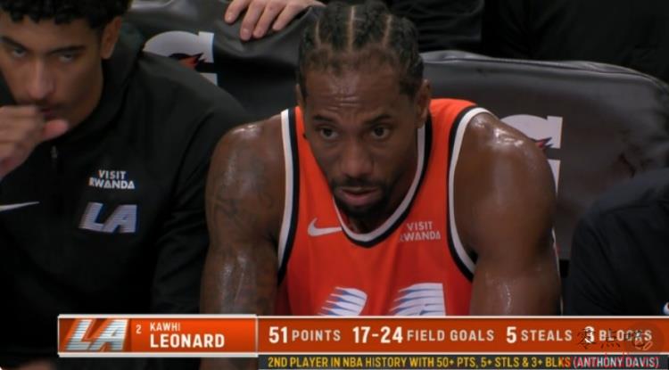 前三节比赛,莱昂纳德得到51分8篮板1助攻5抢断3盖帽,据统计,他成为NBA历史上第二位单场至少50分5抢断3盖帽的球员,第一位是浓眉。