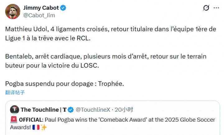 零点吧足球12月29日讯 博格巴昨日获得环足奖最佳复出奖。前法甲球员吉米·卡博特在社媒上转发了博格巴获奖的信息并嘲讽博格巴获奖。