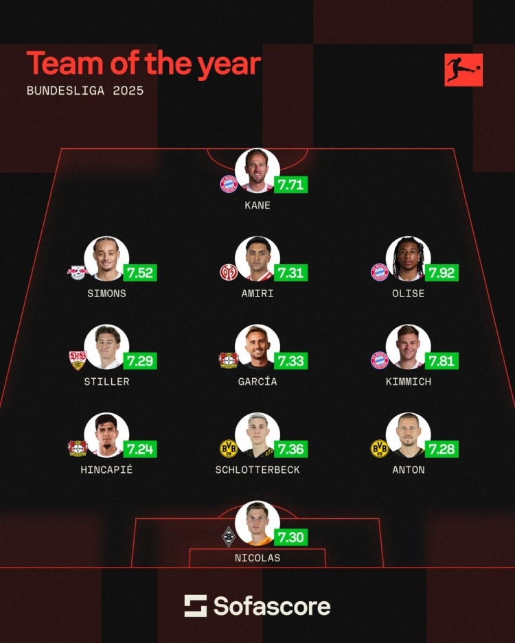 sofascore德甲年度最佳阵:奥利塞、凯恩领衔 基米希、西蒙斯在列