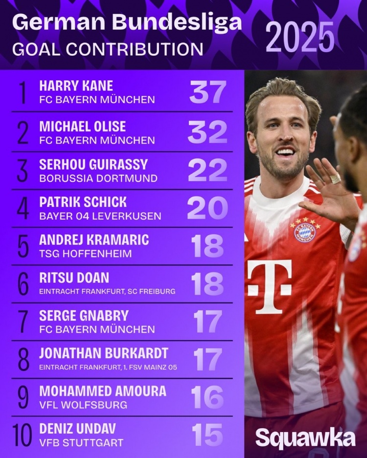 零点吧足球12月30日讯 2025年即将结束,squawka也统计了本年度德甲直接参与进球榜,凯恩和奥利塞均参与了至少30球。