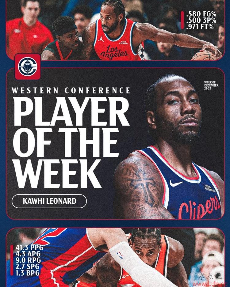 零点吧12月30日讯 今日NBA官方宣布,快船球星莱昂纳德当选西部周最佳球员。