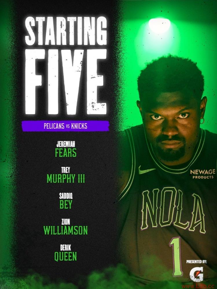 鹈鹕今天在主场迎战尼克斯,赛前首发阵容出炉:费尔斯、墨菲、贝、锡安、奎因