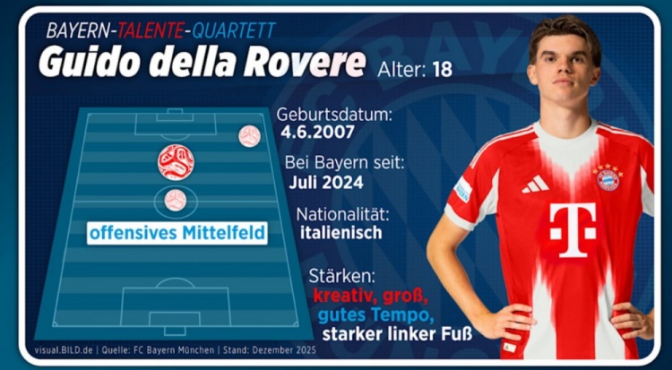 圭多·德拉罗韦雷,这位18岁的攻击型中场身材高大却技术细腻,被誉为“拥有细腻的左脚技术”。作为拜仁U23主力,他在地区联赛中交出了4球9助攻的数据,身价在一年半内增长了六倍。