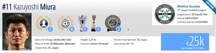 58岁的三浦知良即将开启他的第41个职业生涯赛季。目前三浦知良依旧在德转的数据库中,身价2.5万欧,他是库中年纪最大的球员,没有之一。
