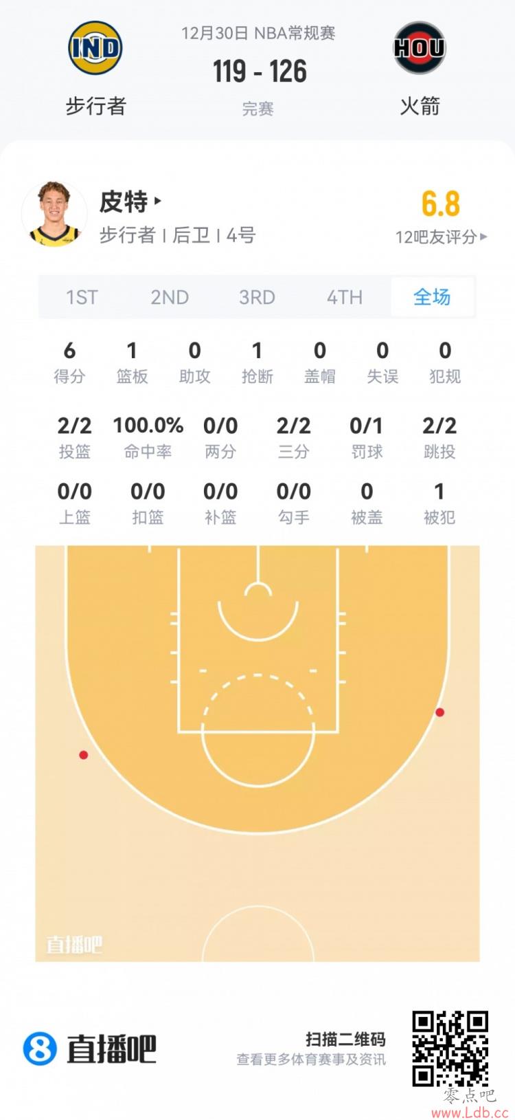 步行者次轮54号秀泰伦·皮特 登场3.7分钟