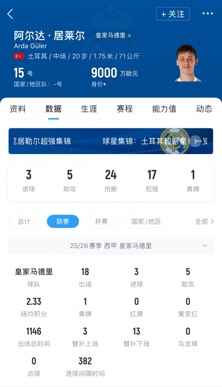 而居莱尔也是第一个达到9000万欧元身价的土耳其球员,本赛季这位20岁的皇马中场出战25次,贡献3球7助。