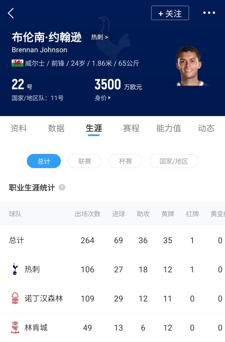 2023年夏窗,布伦南·约翰逊以5500万欧转会费从诺丁汉森林加盟热刺,本赛季球员为热刺出战22场比赛,打进4球,德转身价3500万欧。
